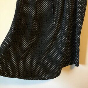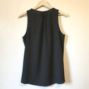 Excellent, preowned condition, crepe-like fabric, black, drawstring sleeveless blouse with tiny white polka dot print throughout. Nice and long. And great for layering. Made U.S.A..