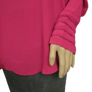 Embrace feminine charm with our long sleeve pink blouse adorned with delicate eyelet holes along the sleeves. The soft, blush pink hue adds a touch of warmth and style, making it a versatile piece for both casual and dressy occasions. The intricate eyelet detailing on the sleeves offers a whimsical and romantic appeal, creating a subtle contrast against the smooth fabric. Designed to flatter with a relaxed fit, it drapes beautifully, enhancing your natural femininity. Whether styled with tailored trousers for a polished office look or with jeans for a relaxed weekend outing, this blouse effortlessly transitions from day to evening wear.
