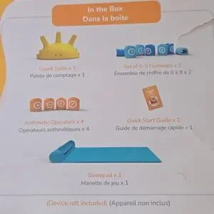 Comes with 1 foldable gamepad, 1 Count Spike, 4 arithmetic operators (+ - x/), and 2 sets of digits 0-9. No Bluetooth and no electronics. The gamepad and Count Spike connect through embedded magnets. A help guide with step-by-step instructions is also included.