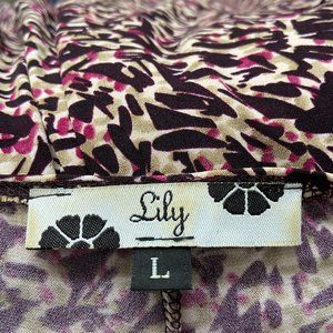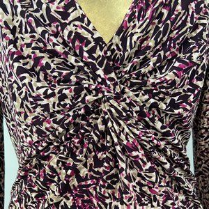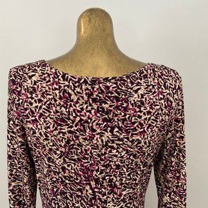 Flattering Plum, Taupe & Cream pattered dress with ruching detail above the waist. Comfortable and perfect for work. Looks great with a blazer or on its own.
