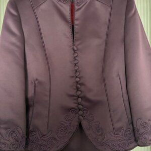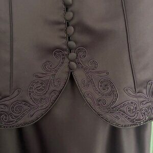 Beautiful satin and embroidered full length lined skirt and jacket with gorgeous beaded handwork at neck, sleeves and bottom of jacket. Jacket is fitted with 3/4 sleeves and has 12 cloth-covered tiny buttons. Jacket has V opening to cleavage. Pristine condition, worn only twice. Generous size 8. Could be used for bride, bridesmaids, fancy evening event, on stage or as lengha.