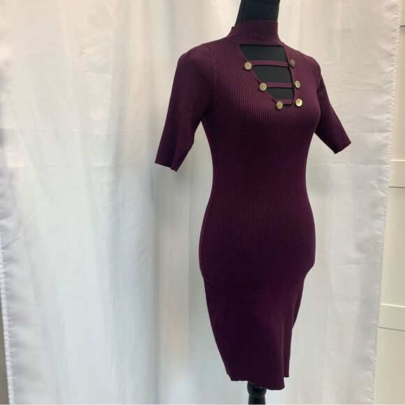 Plum purple short sleeve ribbed high neck bodycon mini dress Sz L