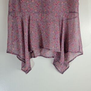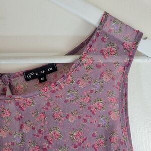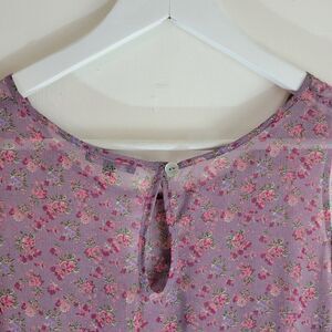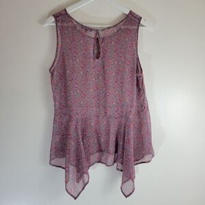 "Plum" ditsy floral purpley mauve and pink sheer light flowy sleeveless summer top with waterfall / hanky hem and keyhole nape. Spare button included. Size M.