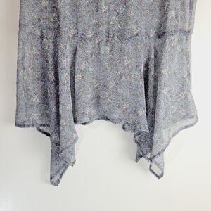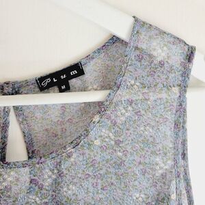 "Plum" ditsy floral sheer light flowy sleeveless summer top with waterfall / hanky hem and keyhole nape. Spare button included. Size M.