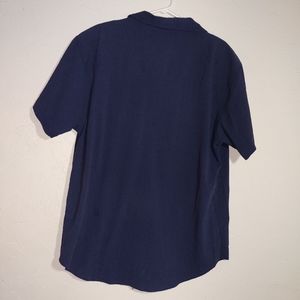 Ladies blouse. Size 40 (XL). color is Navy blue. Crinkled look fabric. Short sleeve. Rounded bottom hem. Short sleeves. Button up. 65% polyester - 35% cotton.
