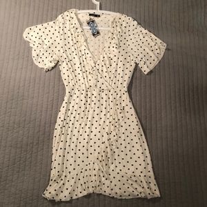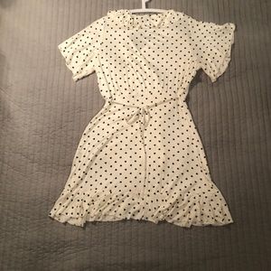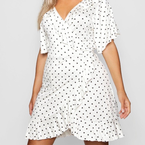 Feminine summer wrap ruffle dress with printed black hearts. Strings to tighten around waist.