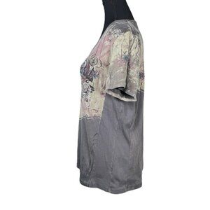 This shirt is a heavier weight with lots of stretch, and a brushed texture and lots of distressed streaks and marks for a rough, vintage look.