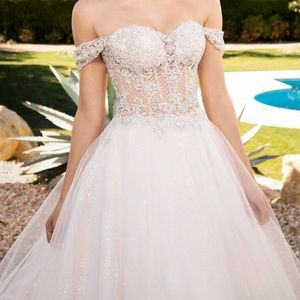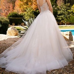 It’s a Casablanca Bridal is a sparkling sensation, for the bride who wants to glimmer from every angle. This stunning ballgown wedding dress features an intricately beaded illusion bodice, accented by a sweetheart neckline and matching straps that can be worn 3 ways. completely strapless, this versatile gown offers options for a reception change! An ethereal sequined tulle skirt catches the light, while silky charmeuse and perfecting satin create a comfortable fit.