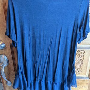 Cute navy top short-sleeve top with pretty handkerchief style trim at the bottom. Pet free, smoke free home.