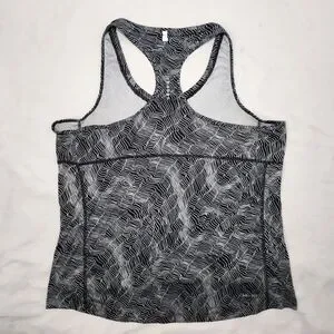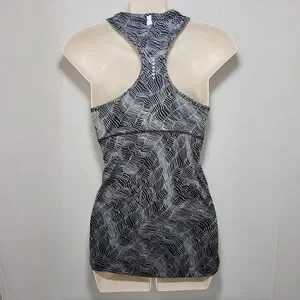 This top has a light material and loose fit, so it's nice and airy when you're working out! The tank top's length is 25 inches long, 42 inches around the bust, 40 inches around the waist, and 46 inches around the hip. Only worn a few times, and I don't see any flaws.