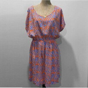 This is a women's dress with a blue background and an orange and white geometric pattern. It has a scoop neckline, cap sleeves, and a relaxed bodice with an elastic waistband. The dress is made of a lightweight, flowing fabric and falls to the knee. It is in excellent condition with no visible signs of wear or damage. The dress is a size 2x and is perfect for a casual summer occasion.