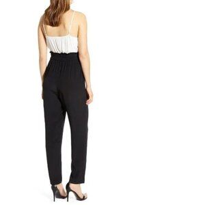 Fun and flirty, a one-and-done color-blocked jumpsuit gets a frilled detail to define and cinch the waist.