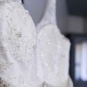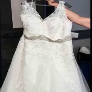 Beautiful plus size wedding dress by Callista Bridal. It has gorgeous lace detail and beadwork, a corset back, and an added sewn on jeweled belt I purchased separately. The train can be left down, or it has a bustle to lift the train off the ground. I am including the matching beaded veil, and the garment bag I have been storing everything in for safekeeping. I believe it was a size 28 but it was altered a bit smaller to be fitted. Please note that it will need to be cleaned.
