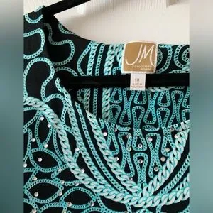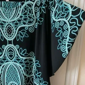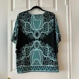 Figure flattering jersey blouse with sparkly accents near neckline and angel sleeves. Easy to wear forgiving fabric & style.