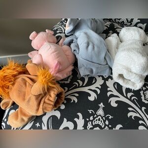 Encourage creative fun with this set of 4 plush hand puppets. Featuring a pink pig, orange lion, gray elephant, and white polar bear, perfect for playtime. Fits adult sized hand. Great condition!