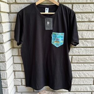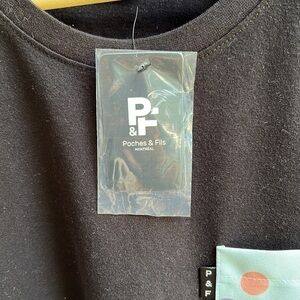 Poches and Fils Montreal Brand Pocket Tee. Black shirt 50% cotton/50%, crew neck, polyester with fun decorative pocket on front.
