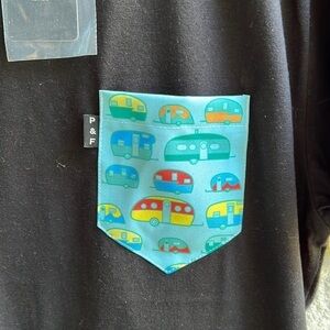 Poches and Fils Montreal Brand Pocket Tee. Black shirt 50% cotton/50%, crew neck, polyester with fun decorative pocket on front.