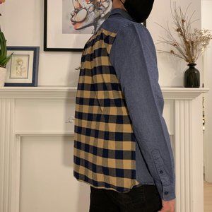 Casual denim button up with yellow/blue checkered back.