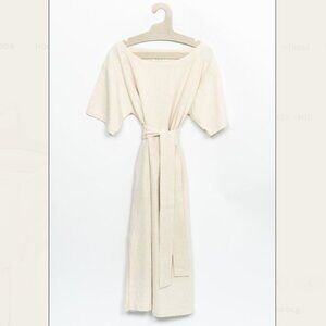 Thick and rustic handwoven-homespun cotton with a wide boatneck, side pockets, and removable tie belt. Ethically made.