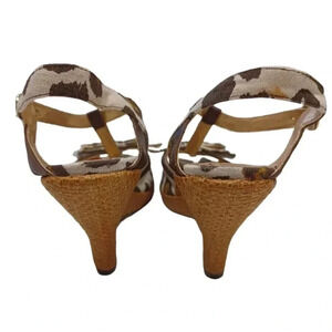 Brown and cream in a leopard print with bow detail and adjustable straps. Wedge heels with a cute design on soles.