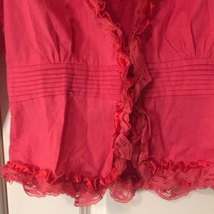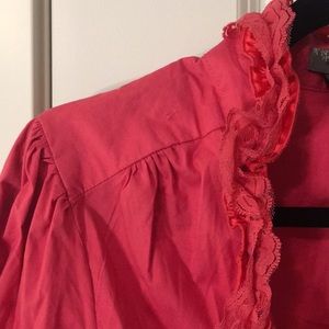 Has puff shoulders, lace and ruffles all around plus satin corset ties on sleeves