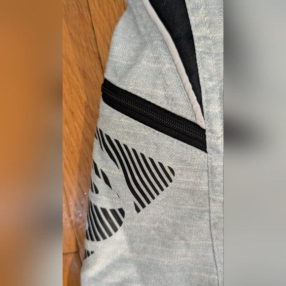 Stylish light gray board shorts. Features black drawstring and side accents. Comfortable fit for swimming.