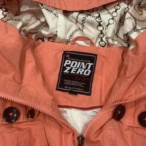 Fully lined salmon, color, zip up jacket, perfect for the spring and fall fully functional weather protection made out of 52% polyester 45% cotton 3% metallic