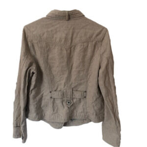 Constructed of 45% linen and 55% cotton, this neutral toned utility jacket will elevate your look and add effortless style to your outfit. Great for layering. Features 2 chest pockets and 2 front pockets with button closures .