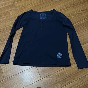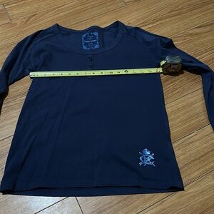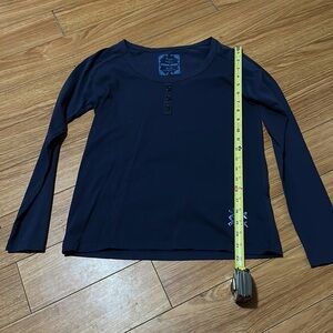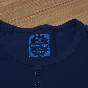 Size medium. Point Zero. Size medium long sleeve too. Faux buttons up the front. 100% cotton. Dark blue.