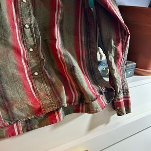 Casual button-down shirt with bold red and tan stripes. Features chest pockets and a relaxed fit. Ideal for everyday wear.