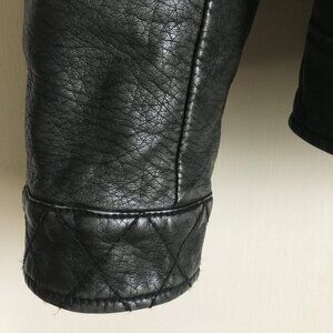 Good preowned condition, vegan leather moto jacket by Point Zero Nicole Benisti. It's black, but picks up warm light nicely for a rich espresso tone. Most PVC is fairly telling, but his looks and feels like real leather. The fabric is heavy and durable as well. There are one or two marks, but they are small and looks just like leather nicks. This jacket originally came with a faux sheep shearling insert for the collar, but it was taken out. I haven't been able to locate it, but I will do another look around. Canadian brand by Montreal designer.