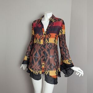 Make a bold entrance in this vintage Point Zero x Nicole Benisti blouse, featuring a sheer, flowy silhouette with an Aztec-inspired tribal print, ruffled hem, and statement flared sleeves. Vertical micro-pleating gives it a flattering stretch, making it a flexible fit that hugs and drapes beautifully.