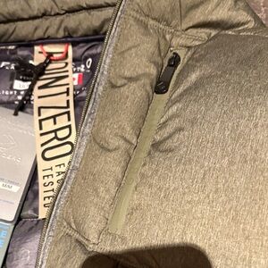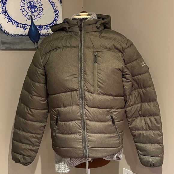 Stylish olive puffer jacket by Point Zero. Features a hood and zippered pockets. Perfect for cold weather.
