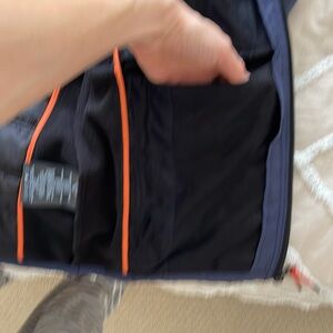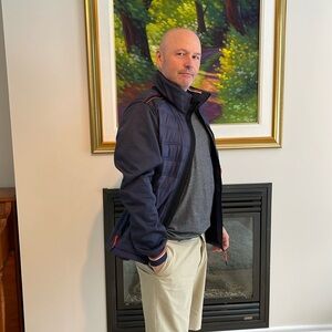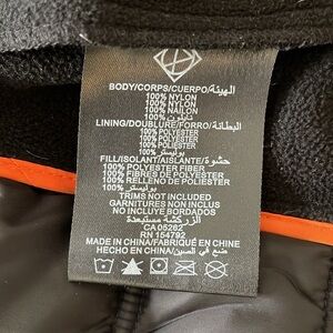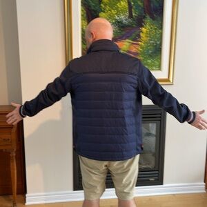 Only worn a few times, beautifully made. On the outside, two pockets, one chest pocket. On the inside two mesh pockets. Packable hood in collar, cinching at the bottom hem. Measurements in the photos.