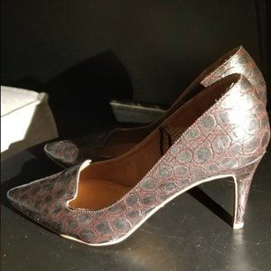 Pointed toe heeled loafers with a brown faux alligator finish. Barely worn, like new condition.