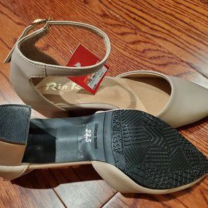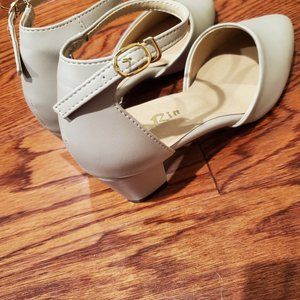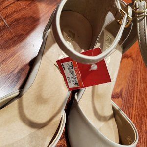 Khaki/beige colored block pumps with a pointed heel. Super comfy and elegant. Was gifted but I have too many shoes so they're still brand new with tags. Original price was $390 CAD. They're 23.5 cm or size 7 women's US. Will lower by $5 if you buy 2 or more items.