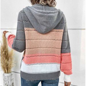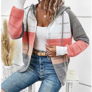 Pointelle Knit Drawstring Zip Hooded Cardigan