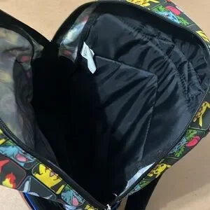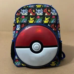 Pokémon backpack with print featuring various Pokemon characters, outer mesh pocket, adjustable straps, padded back, and hard shell pokeball compartment.