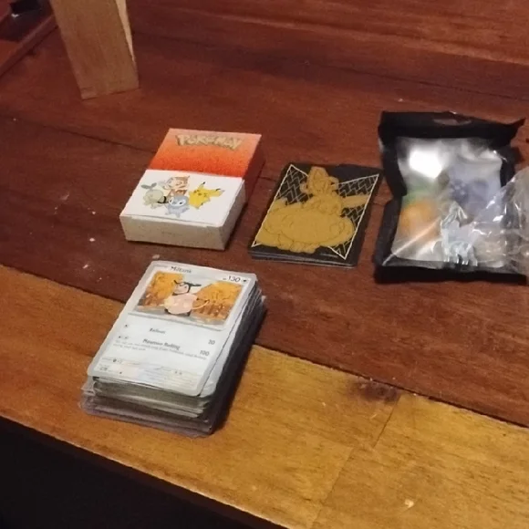 Pokemon card collection featuring a variety of cards and a themed box. Includes a Mewtwo card.