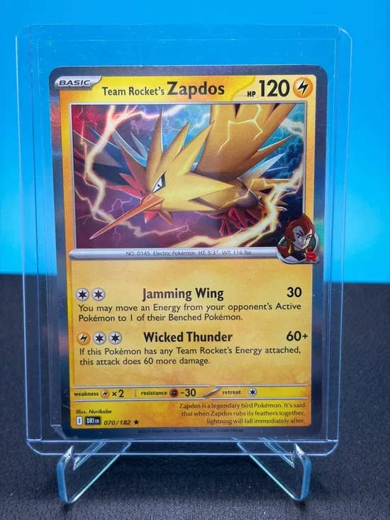 Pokemon Team Rocket's Zapdos Holo trading card. Bold lightning-themed illustration. Great for collectors and fans. Near mint from booster to sleeve to top loader.