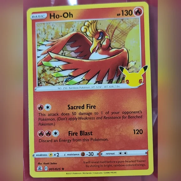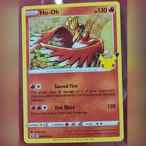 Elevate your Pokémon TCG collection with the iconic 001/025 Ho-Oh HOLO card from the special Celebrations set. This card features the majestic fire-type Legendary Pokémon, Ho-Oh, rendered in a stunning holo finish that captures the eye with every flick of the light.