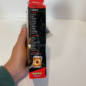 Box is opened and has rips/tears/flaps hang loose. Cards are new unused, Lucario card has a bend/warp. All cards included.