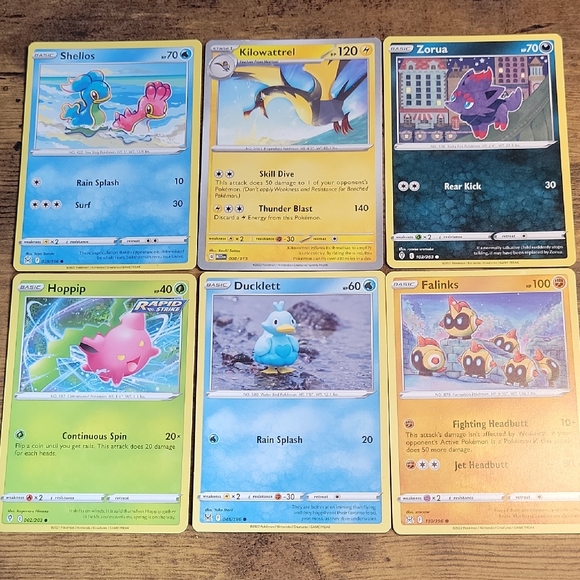 Set of six Pokemon trading cards featuring vibrant designs. Includes characters like Shellos, Kilowattrel, and Zorua. Perfect for collectors and fans.