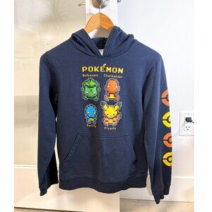Catch ’em all in style with this cozy navy Pokémon hoodie featuring classic 8-bit characters — Bulbasaur, Charmander, Squirtle, and Pikachu!