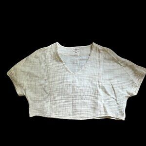Made with a luxe fabric composed of doubled Turkish muslin cotton. The crinkle muslin texture is incredibly soft on the skin, and feels lightweight, yet substantial when worn. Designed in an oversized style, the Crinkle Crop Top has half sleeves, with a cropped cut at the waist, and a V neckline.