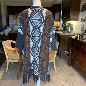 Pol cape, poncho, knit, slate grey, brown, white, EUC, sleeved, fringe, tribal
