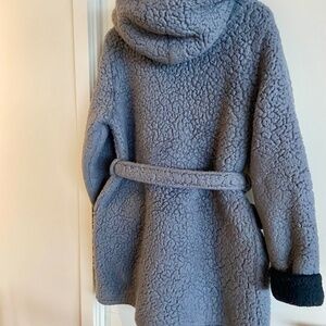 Polar fleece mid length robe with oversized hood and beaver design on each front pocket.