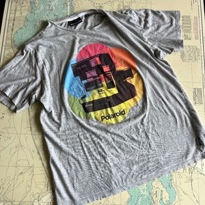 Super soft grey tee made by Only & Sons with registered Polaroid rainbow camera graphic. Has very small hole at collar on left shoulder. Tagged as a size large, measures 19" across shoulders, 21.5" pit to pit, 25" long.