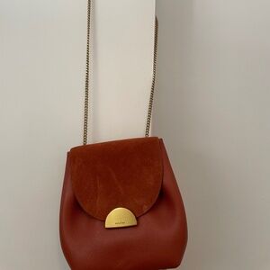 A true showstopper of a bag that can be dressed up or down, worn on the shoulder or crossbody. The unique red taupe/salmon tone of the leather is beautifully complemented by the brushed gold hardware.