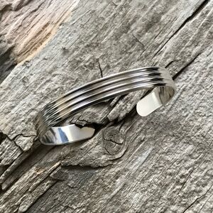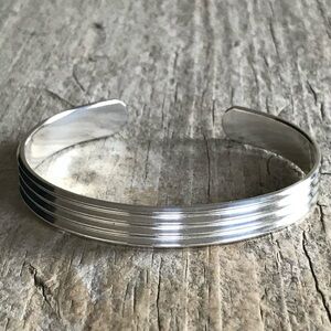 This sterling silver pinstripe open cuff bracelet is hand forged from sterling silver, then polished to a high shine. A great open cuff bracelet that's slightly adjustable and can be worn alone, or stacked with other bracelets to achieve your look.